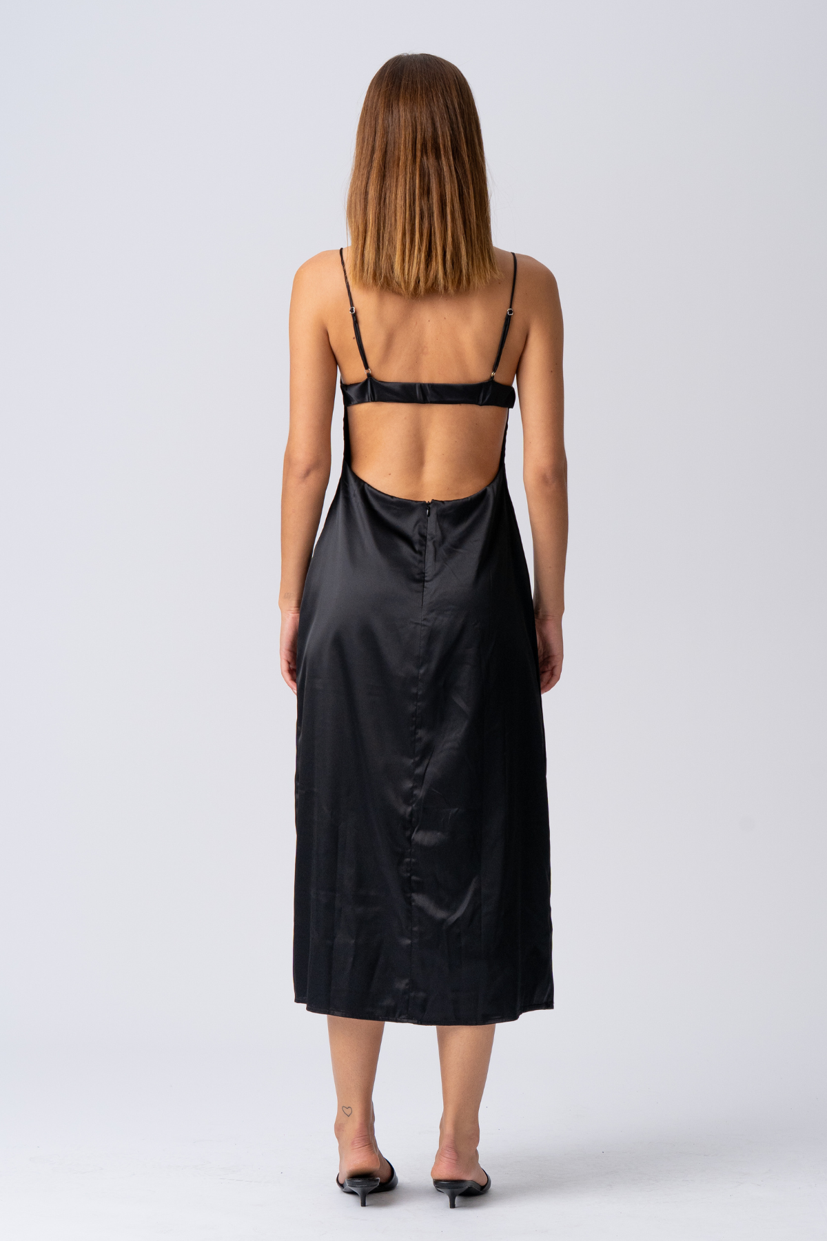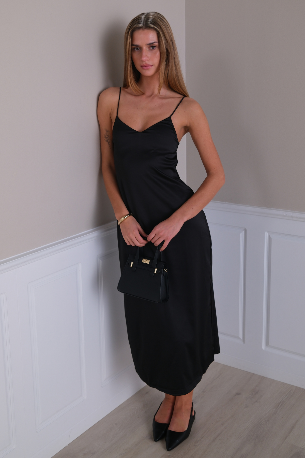 Denna svarta bandklänning är mer än bara ett vackert plagg. Den är skapad för att du ska känna dig självsäker och bekväm, oavsett vart dagen tar dig. Materialvalet, 100% polyester, bidrar till en lyxig känsla samtidigt som det är otroligt praktiskt.