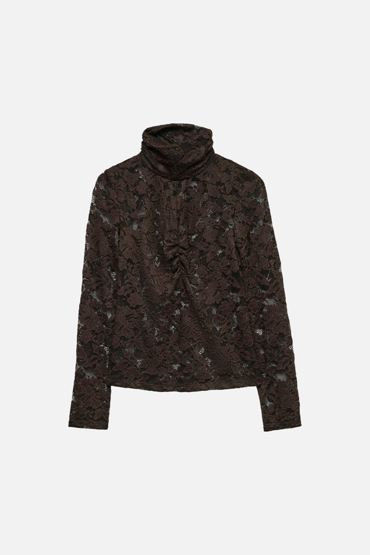 Toppens höga hals ger den en elegant och sofistikerad look som passar perfekt både till vardags och vid speciella tillfällen. Den mörka bruna nyansen, inspirerad av rik choklad, utstrålar värme och tidlöshet. Den omsorgsfulla konstruktionen och passformen gör att den sitter snyggt och bekvämt, vilket gör den till ett utmärkt val oavsett om du vill klä upp din vardag eller skapa en stilren look på kvällen.
